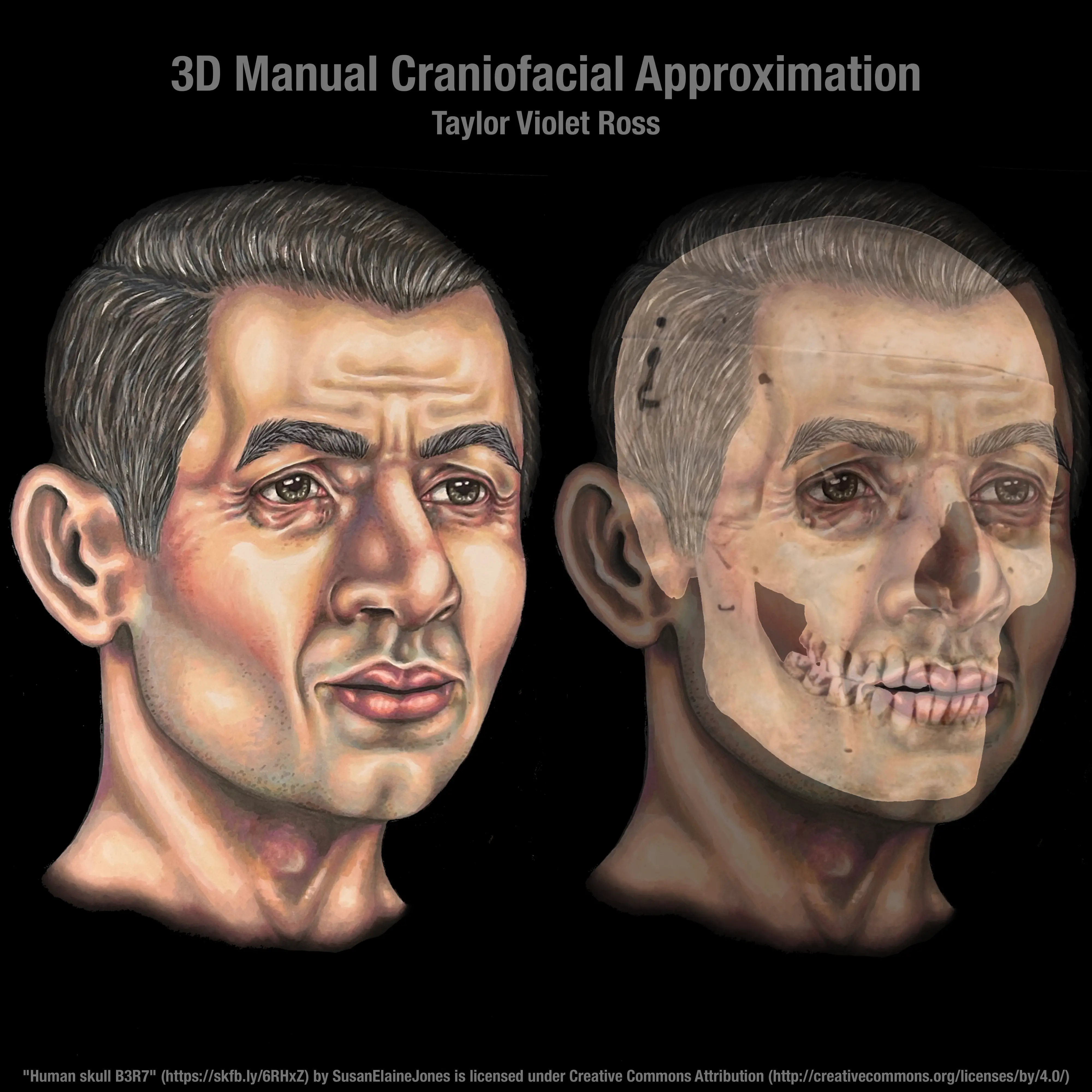 Craniofacial approximation of a skull from a collection of retired medical skeletons within the UK. The skull was 3D printed, with 3D manual approximation processes applied. 2D texturings were done in both alcohol markers & paint as well as digital texturings within Procreate. Special thanks Susan Elaine Jones (susanelainejones.com) for providing vital information as well as for doing such an amazing job 3D scanning the skull.