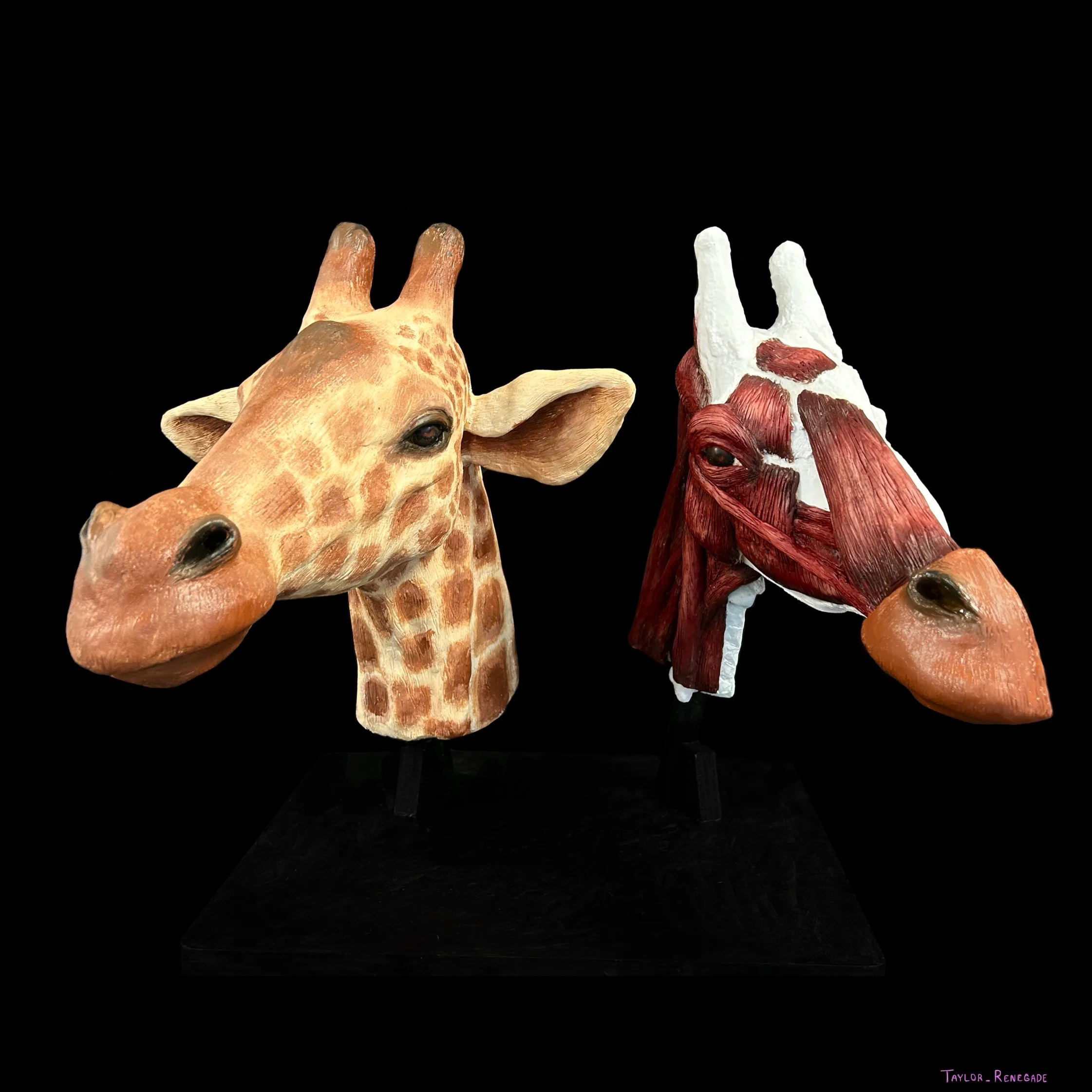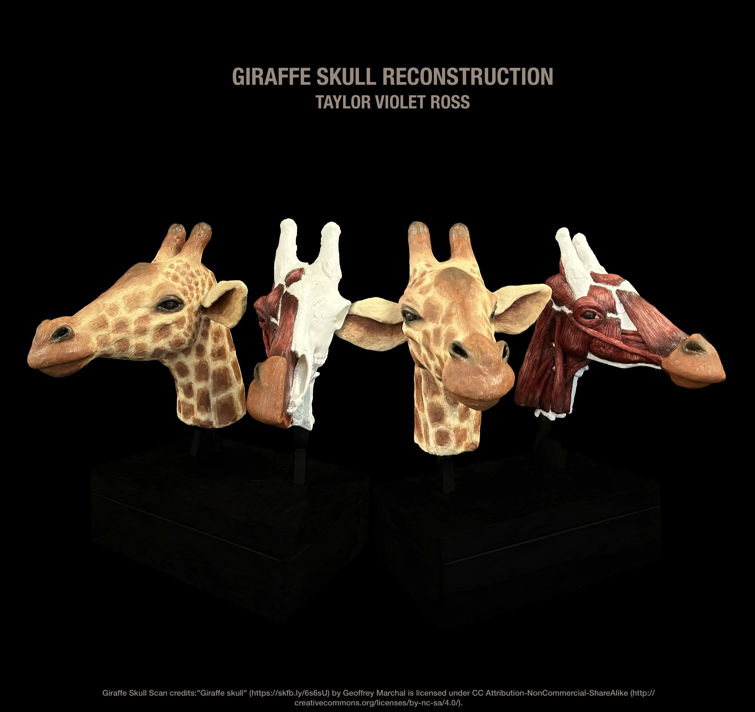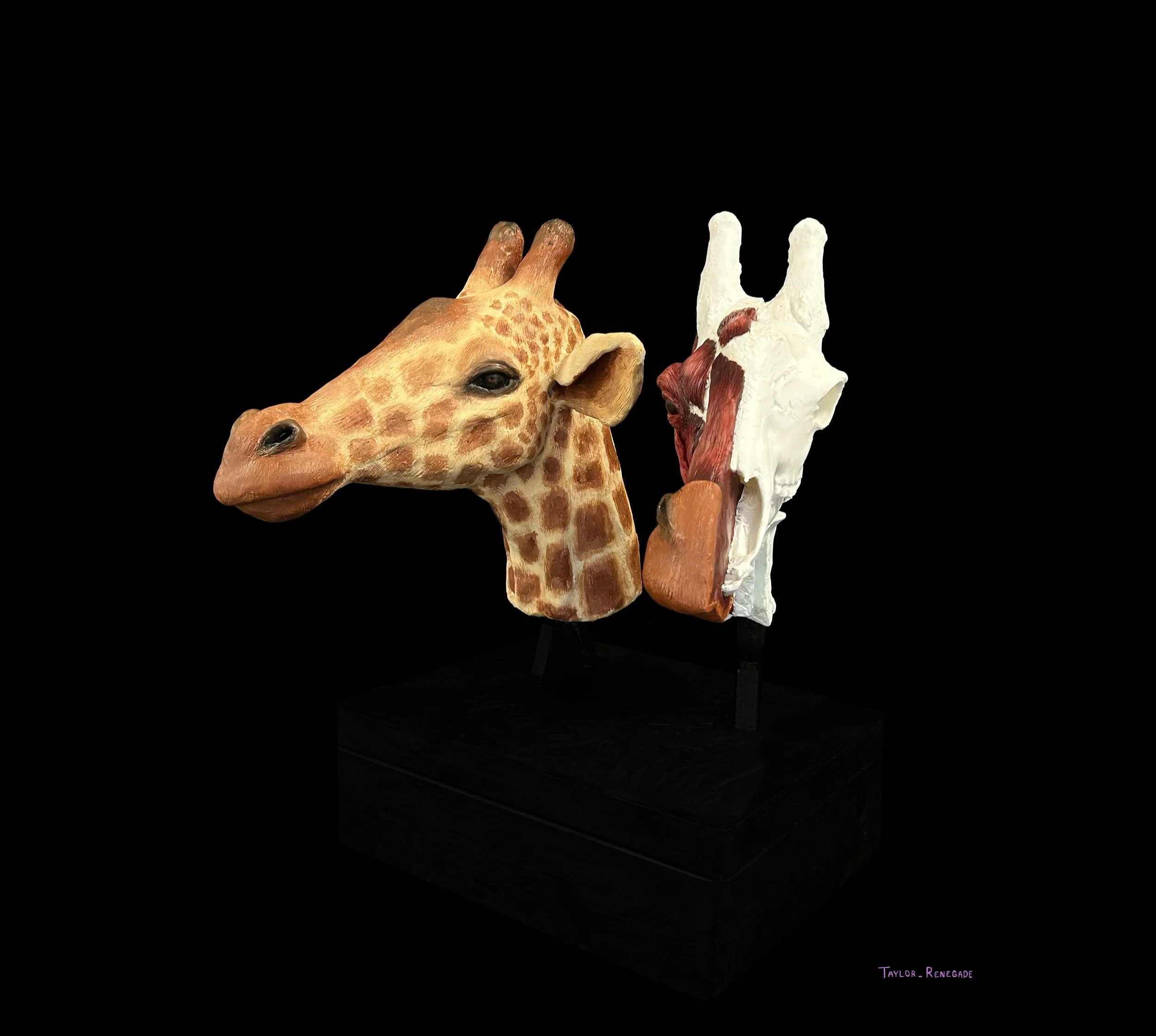 This is a self directed project as part of my MSc Forensic Art and Facial Imaging Course. Ever since I can remember, Giraffes have always been my favourite animal. I was able to get access to a 3D scanned giraffe skull through Geoffrey Marchal on SketchFab, and 3D printed the skull twice to use within this project. One giraffe is a full reconstruction looking to recreate a finished likeness of the giraffe, and one is an ecorche showing both the muscle and bone layers.