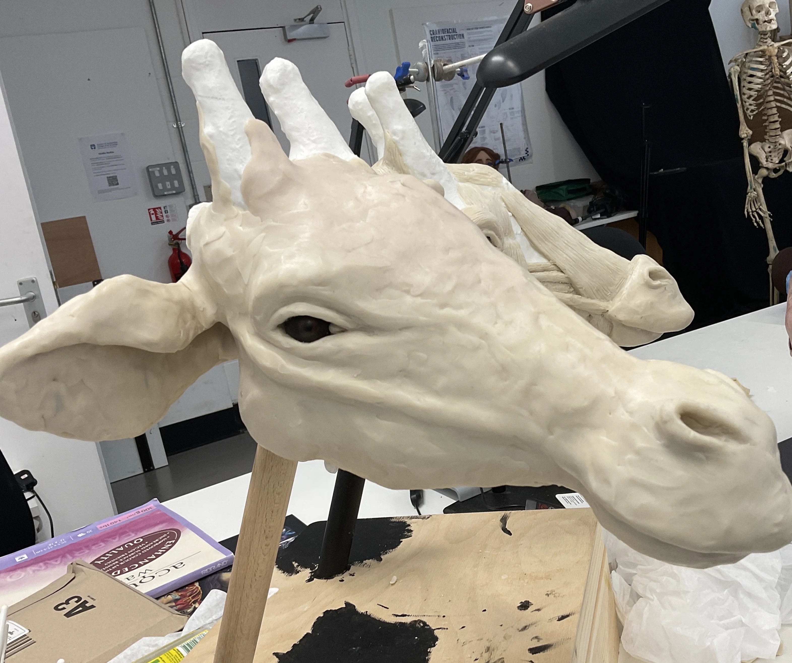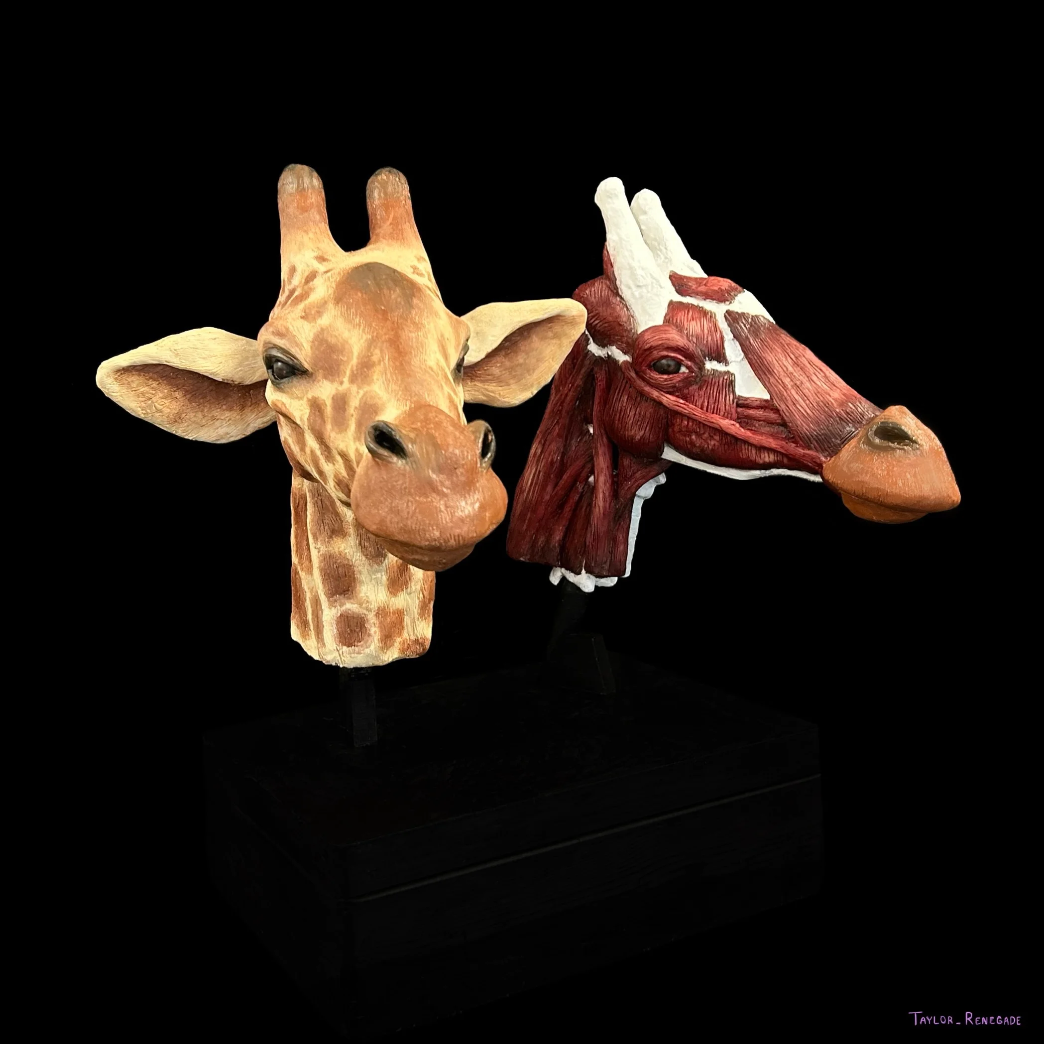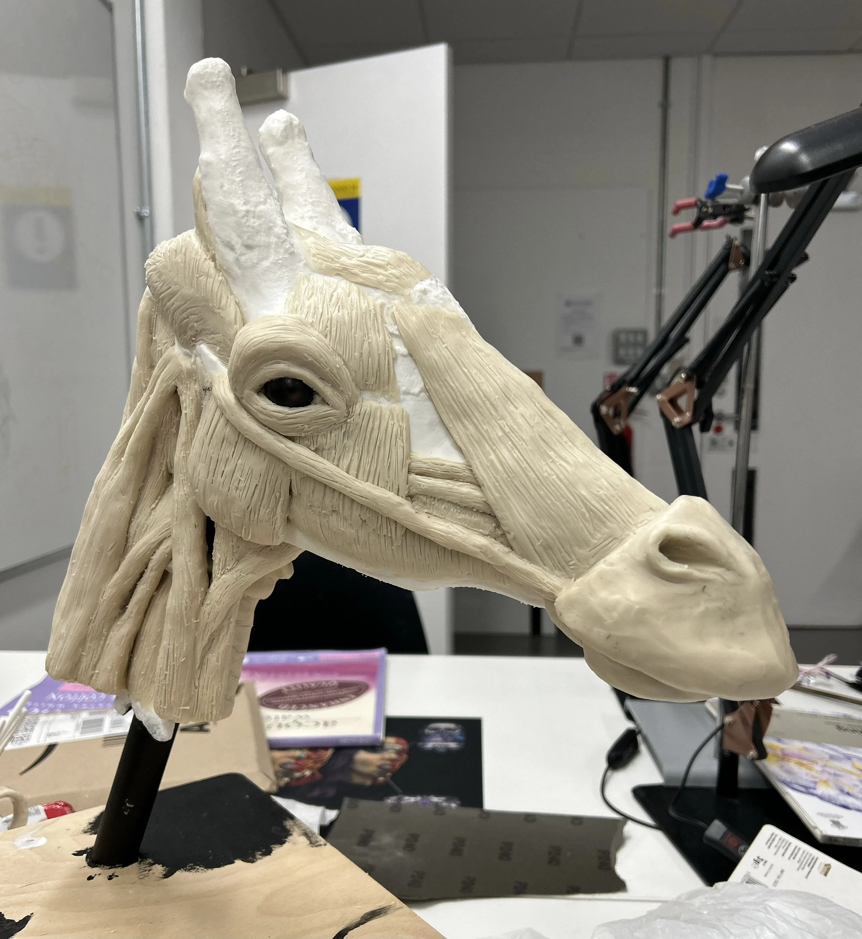 This is a self directed project as part of my MSc Forensic Art and Facial Imaging Course. Ever since I can remember, Giraffes have always been my favourite animal. I was able to get access to a 3D scanned giraffe skull through Geoffrey Marchal on SketchFab, and 3D printed the skull twice to use within this project. One giraffe is a full reconstruction looking to recreate a finished likeness of the giraffe, and one is an ecorche showing both the muscle and bone layers.