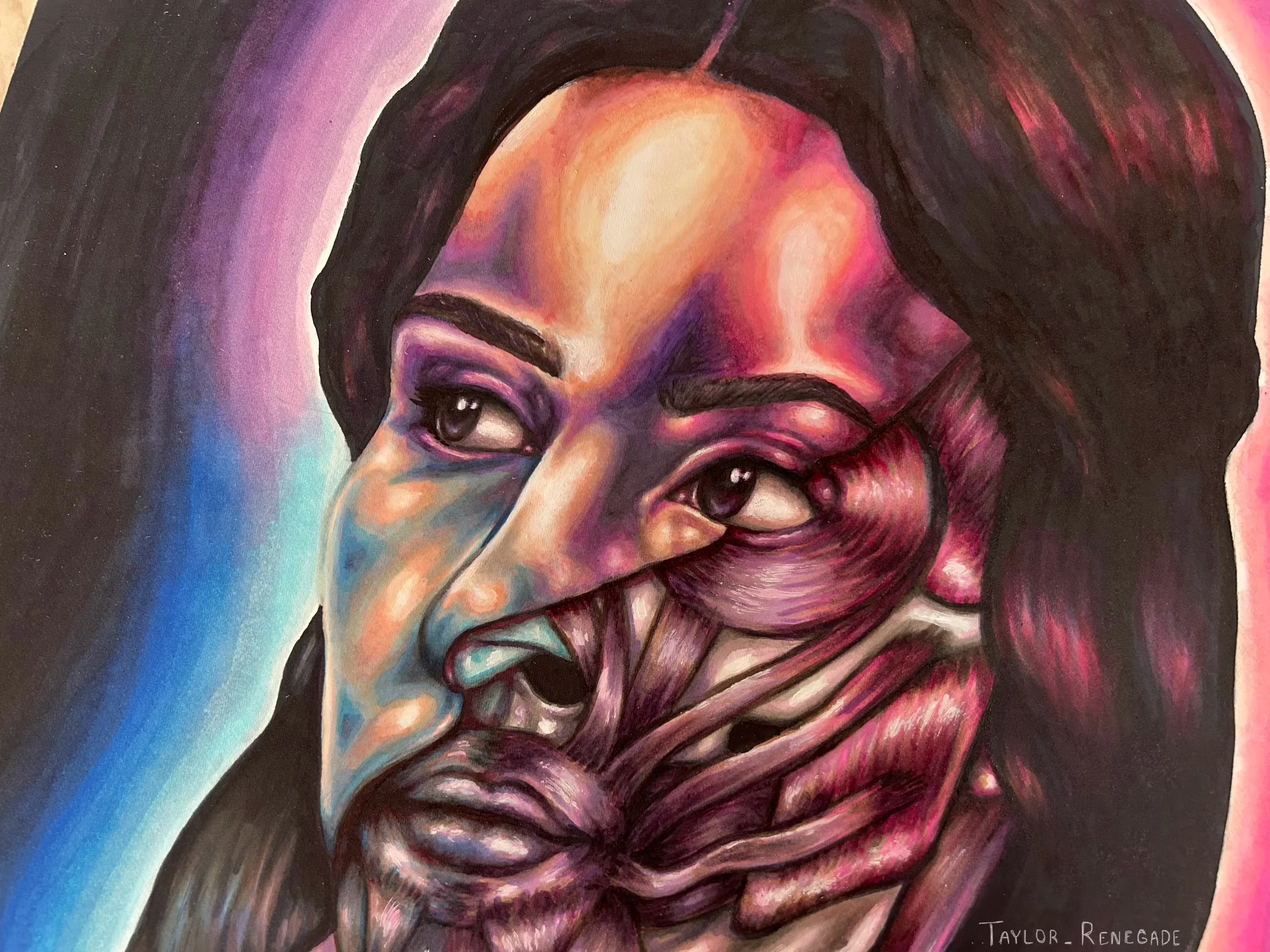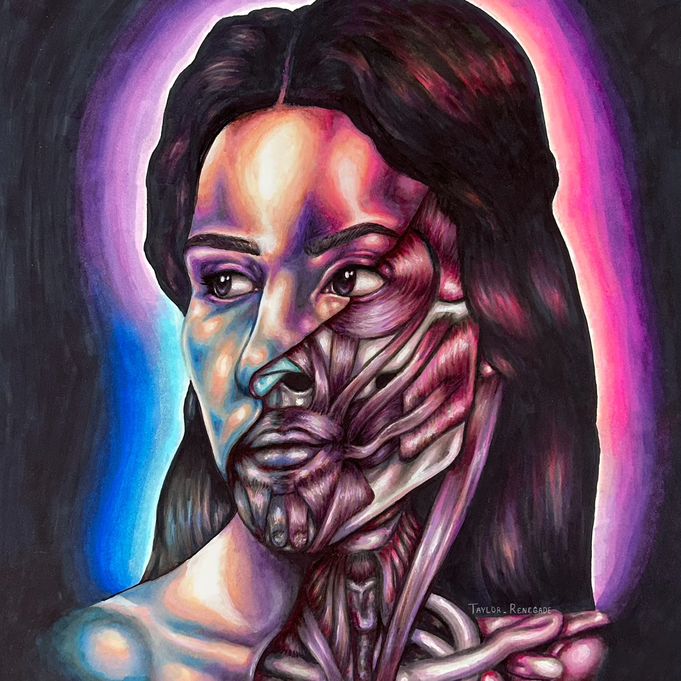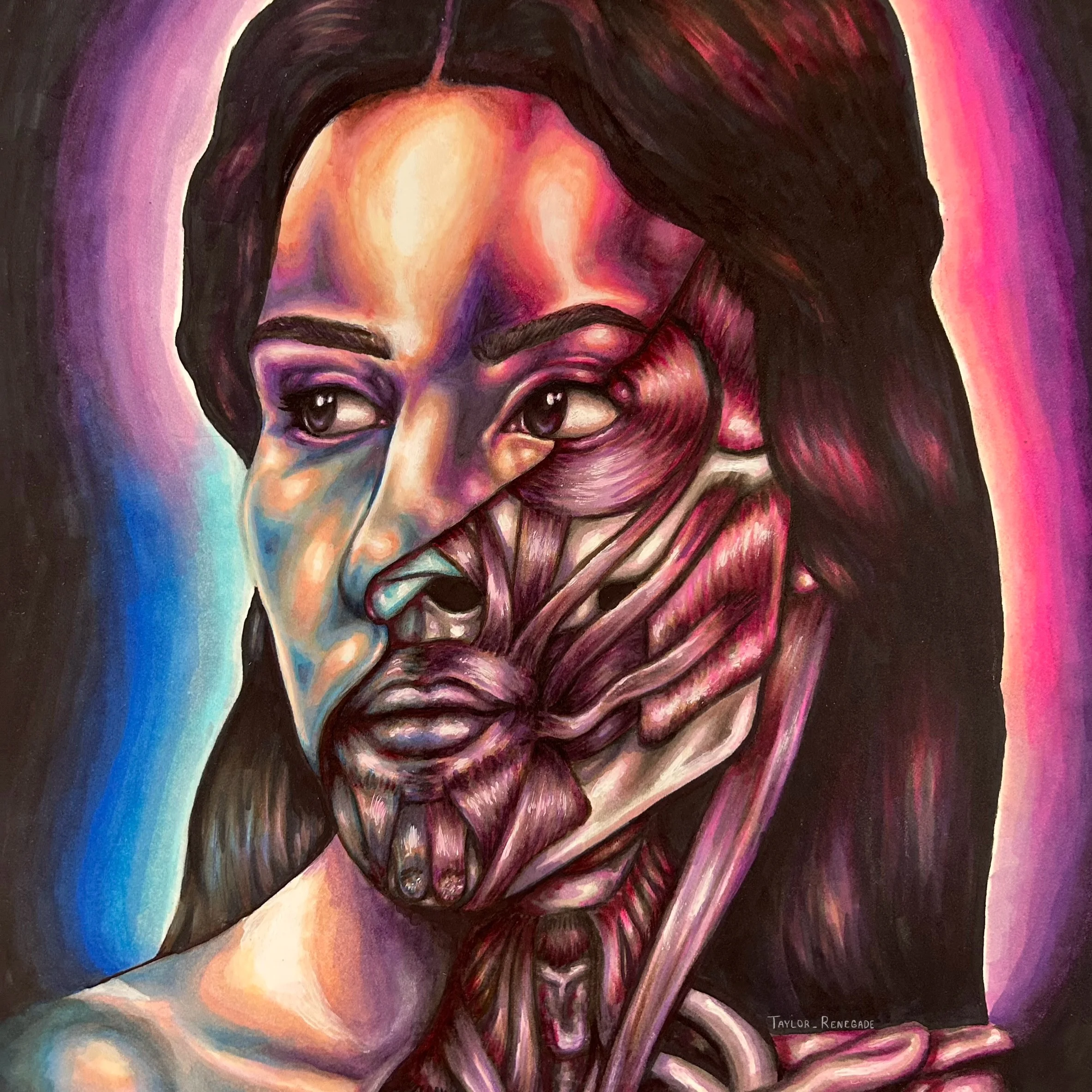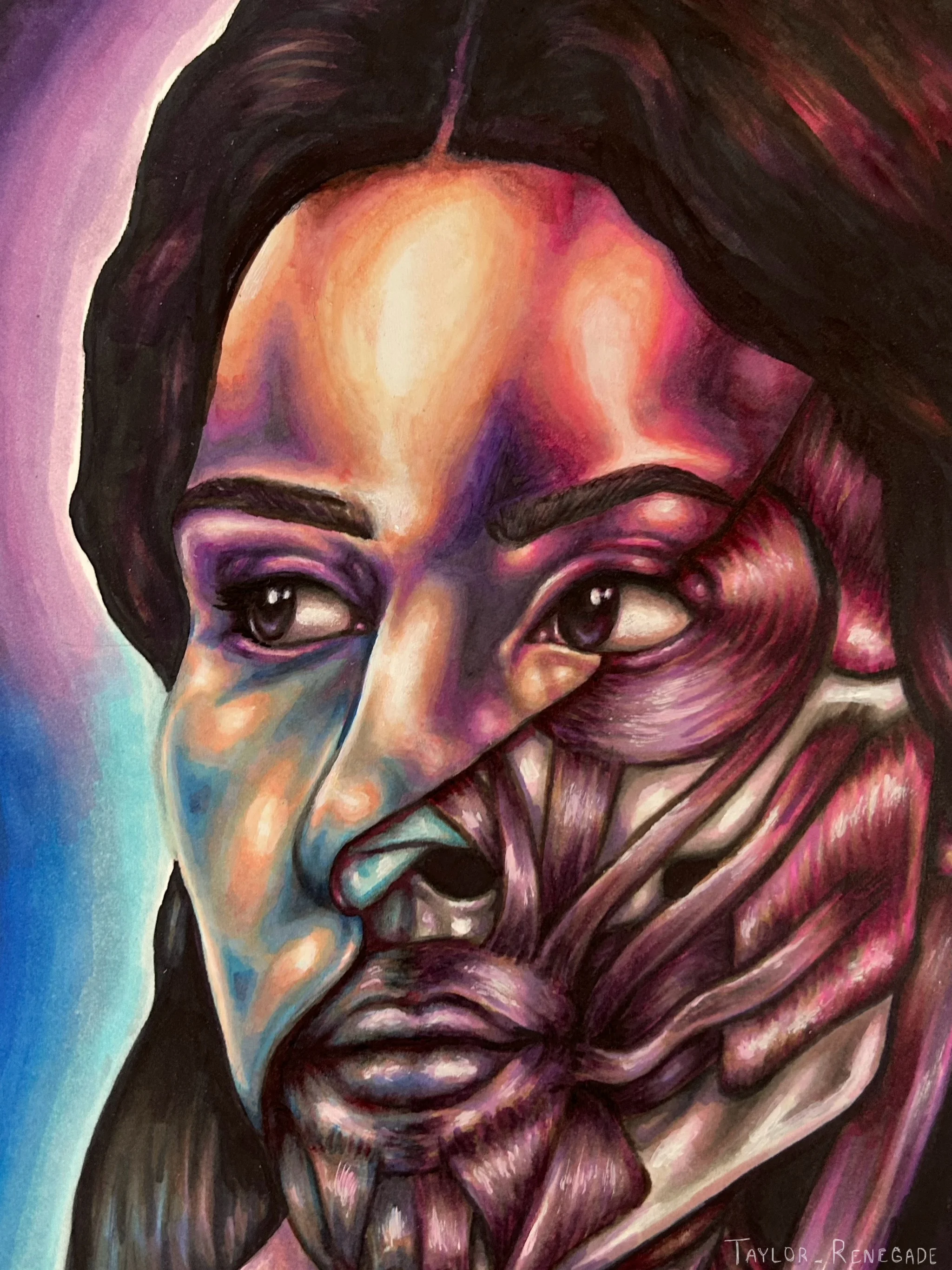An exploratory ecorche exploring human anatomy as well as artistic principles like colour and exaggeration. This piece is a mixture between the more science based parts of my work, and mixing that with the exploratory nature of my alcohol marker portraits.