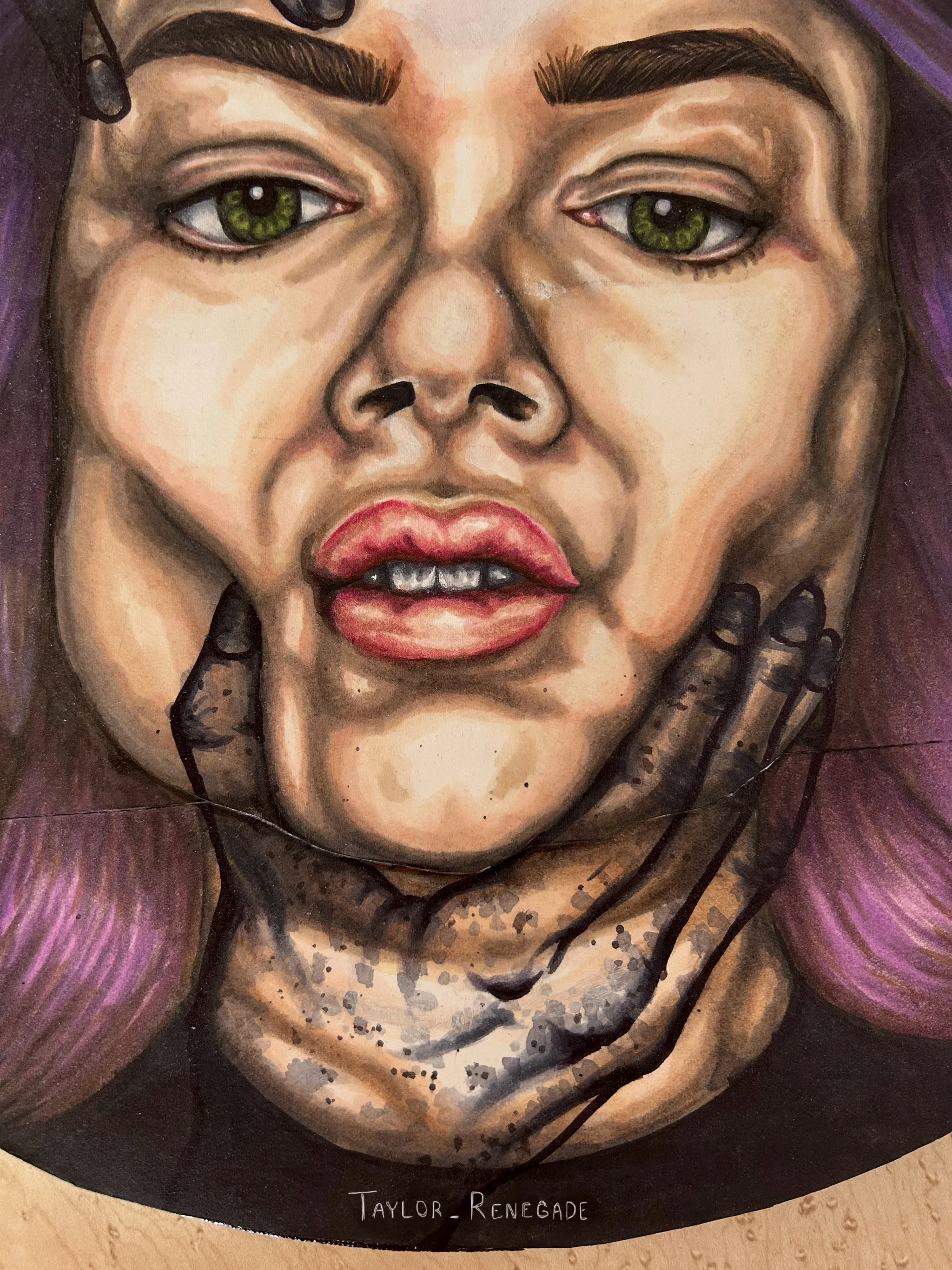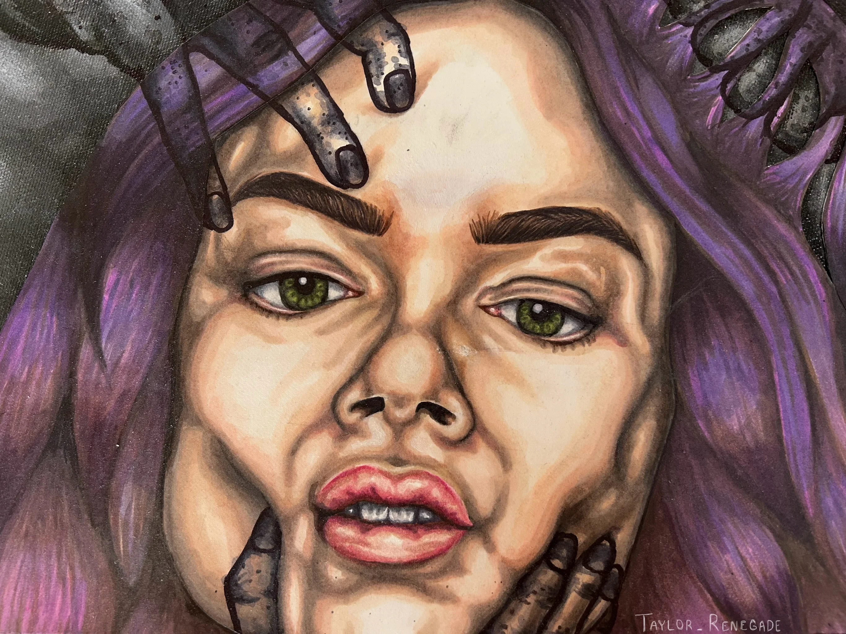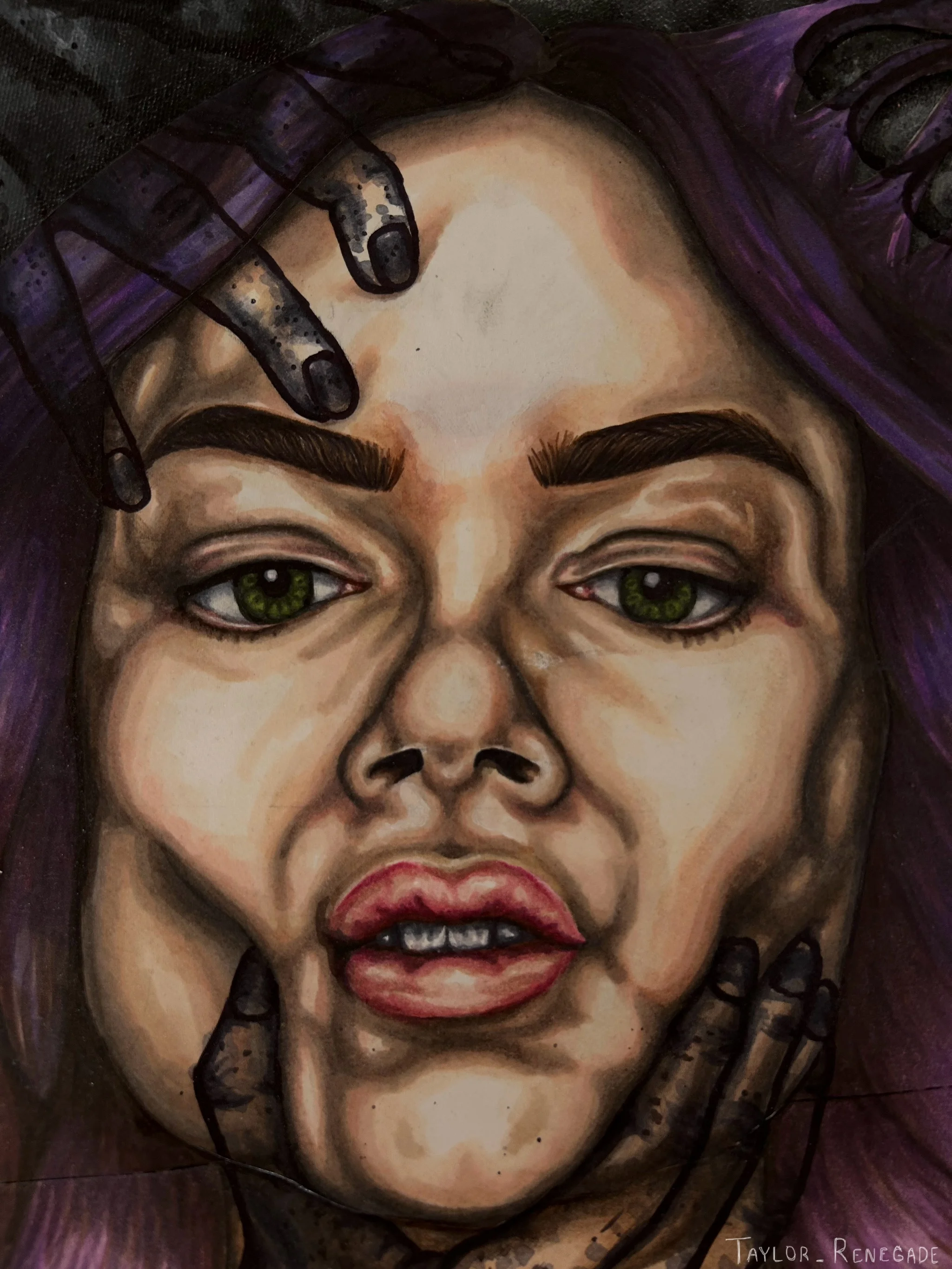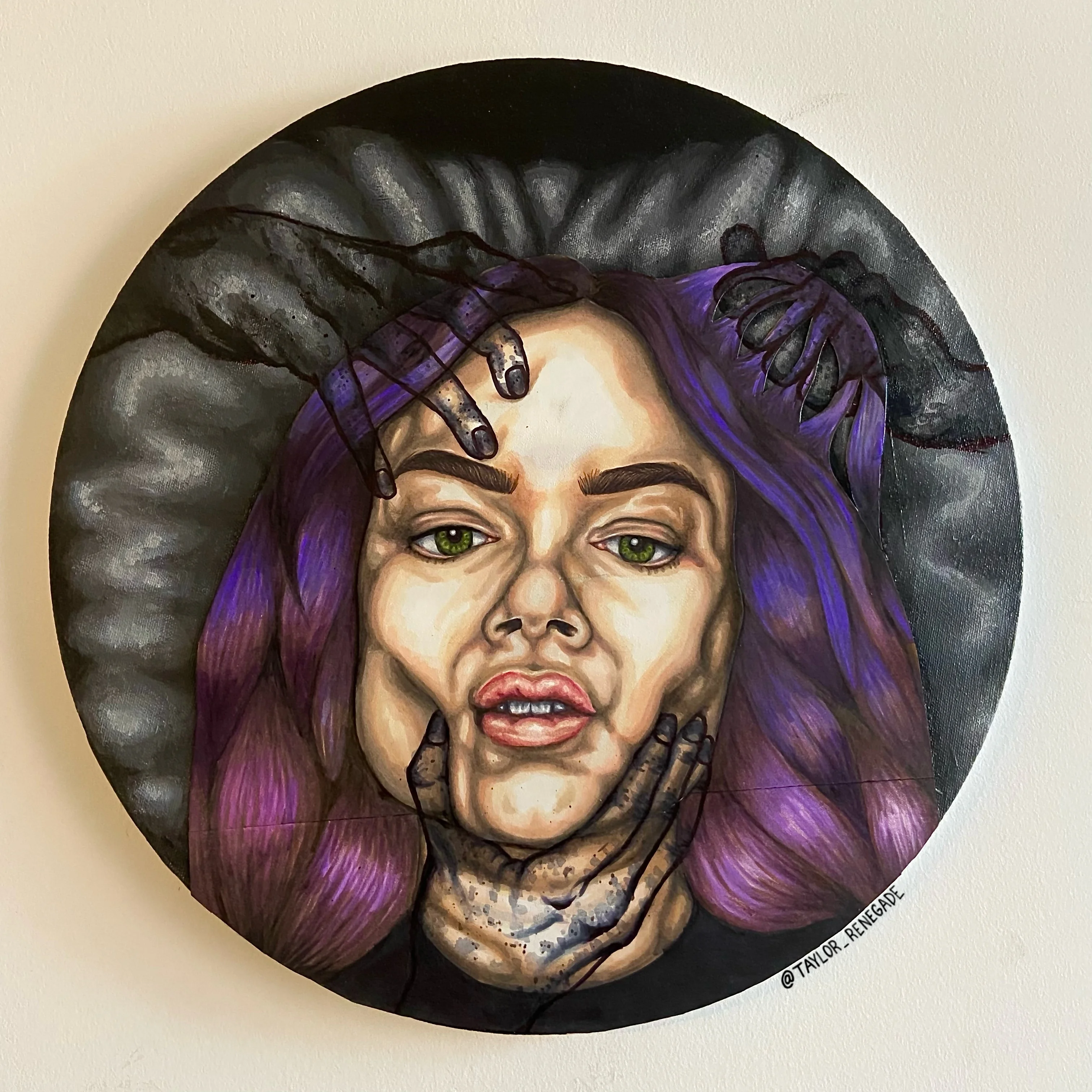 This is a self portrait piece created in the height of my self isolation that followed a traumatic hospital stay. After I got out of the hospital, I didn't create any art for close to 6 months. This piece was my first time allowing myself to create, with the support of my professor Tannis Nielsen. It is a depiction of trauma as a physical entity that can interact and apply pressure to your skin, showing internal struggles as something external. The imagery also came from my own experience with sleep paralysis, and that feeling of unseen entities pushing and pulling at your body.