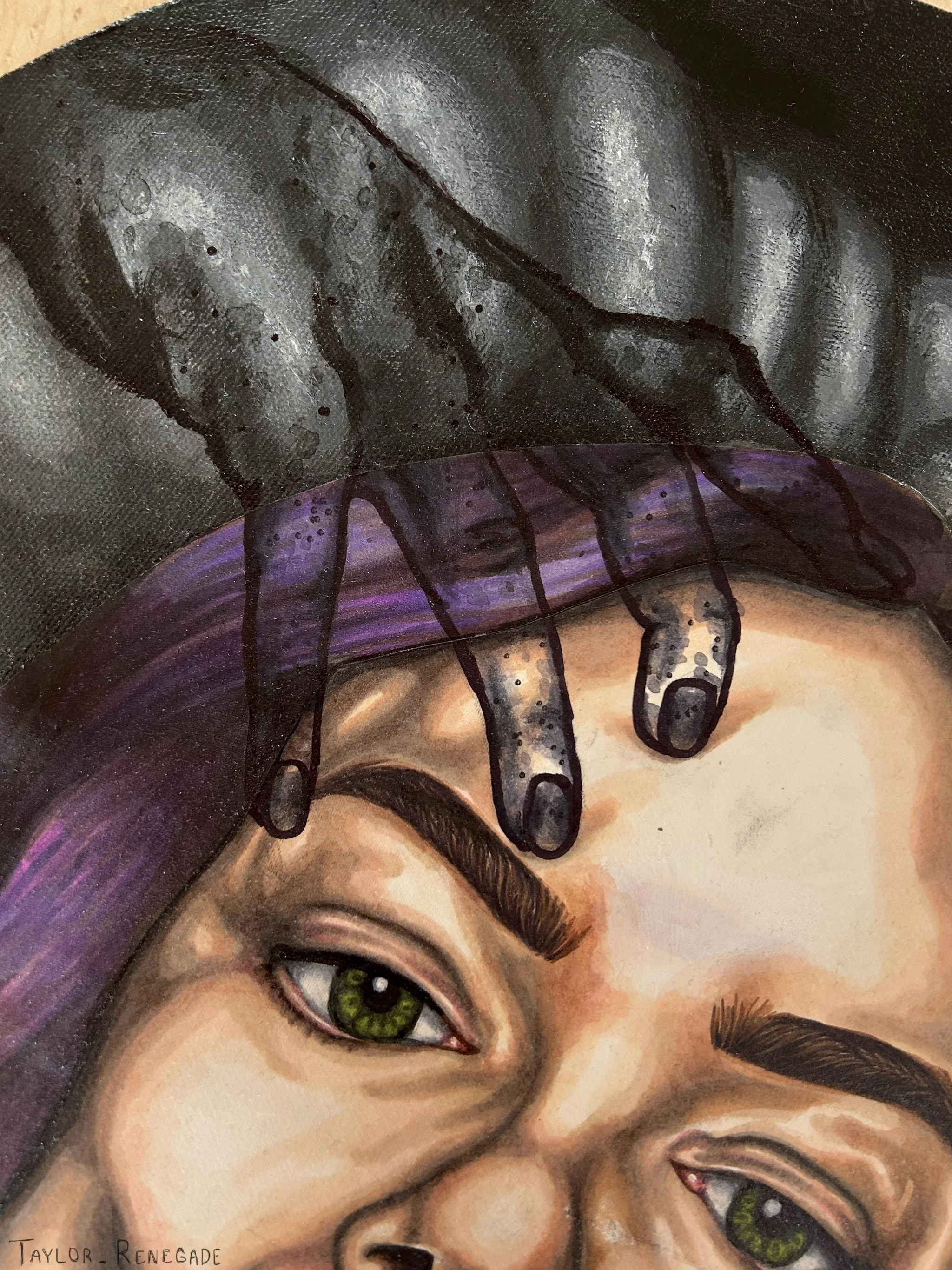 Year: 2021Materials: Alcohol Markers, Inks, Acrylic Paint, Sharpie Markers, Watercolour Paper, Canvas (16 Inch Diameter)