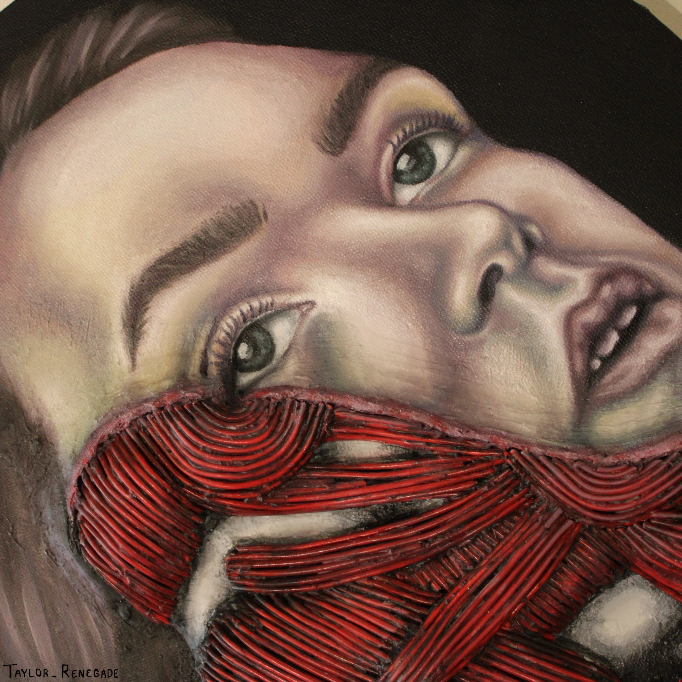 Year: 2025Materials: Oil Paint, Electrical Wire, Plaster Wrap, Masking Tape on 24” Diameter Circular Canvas