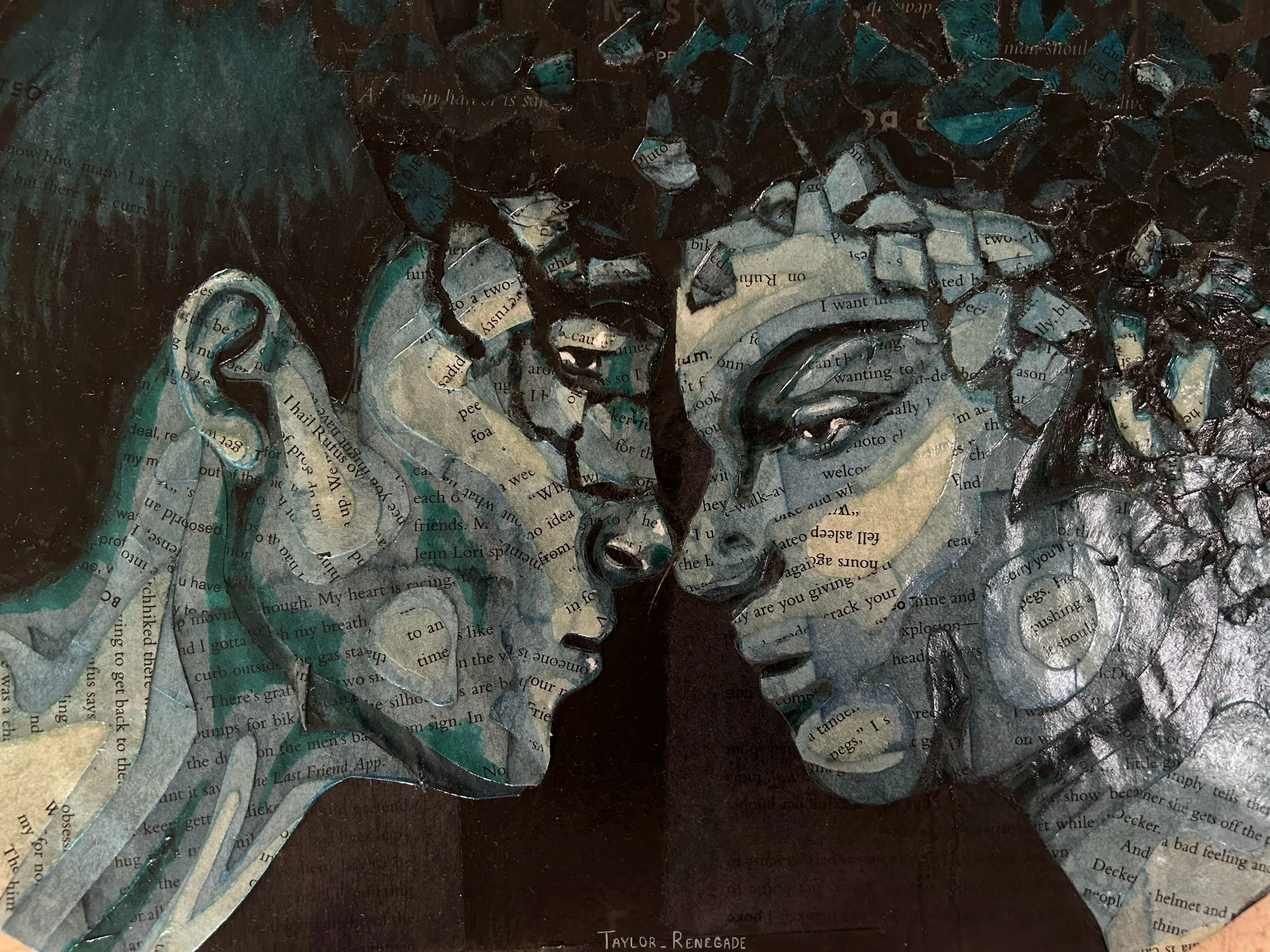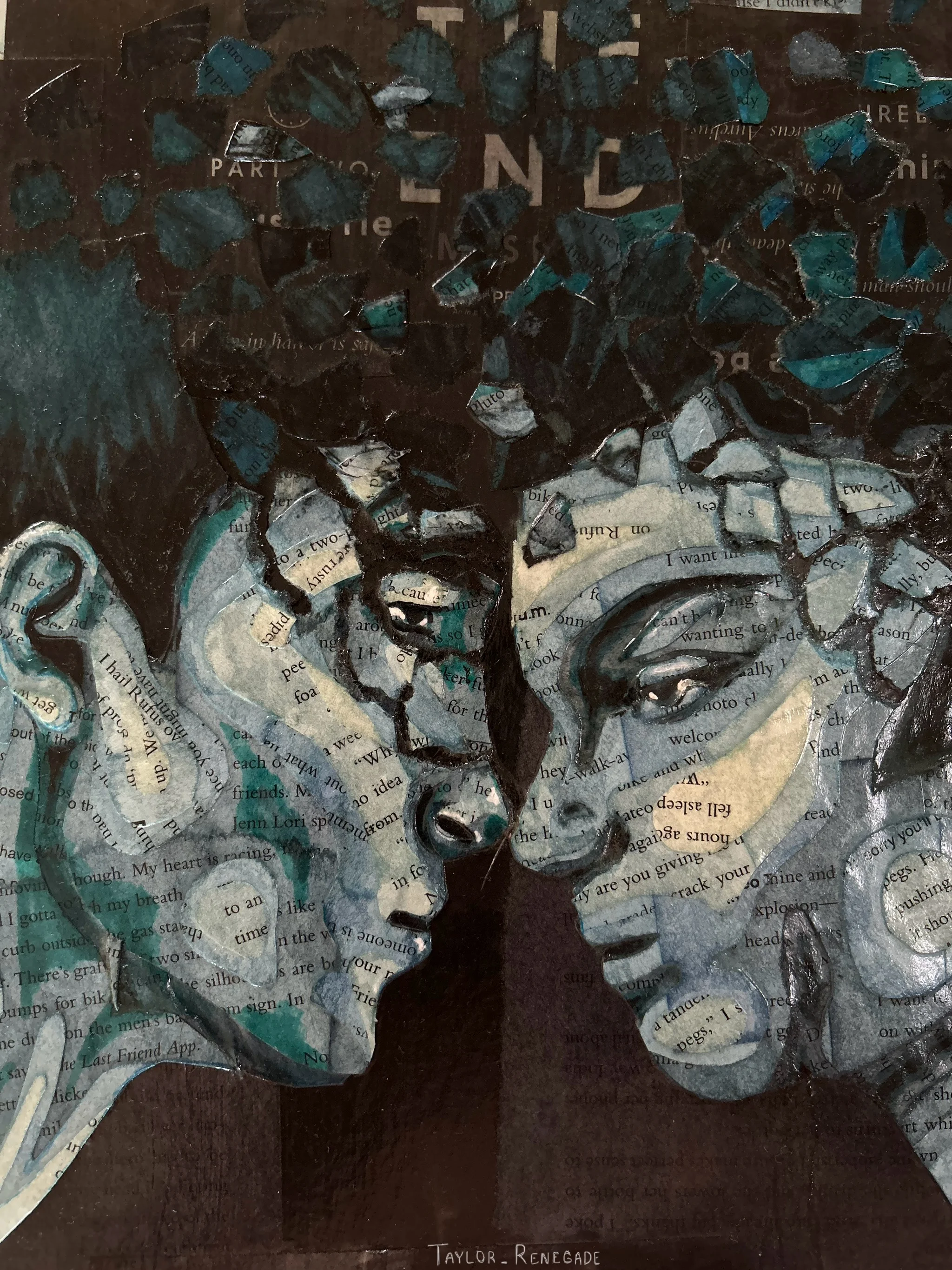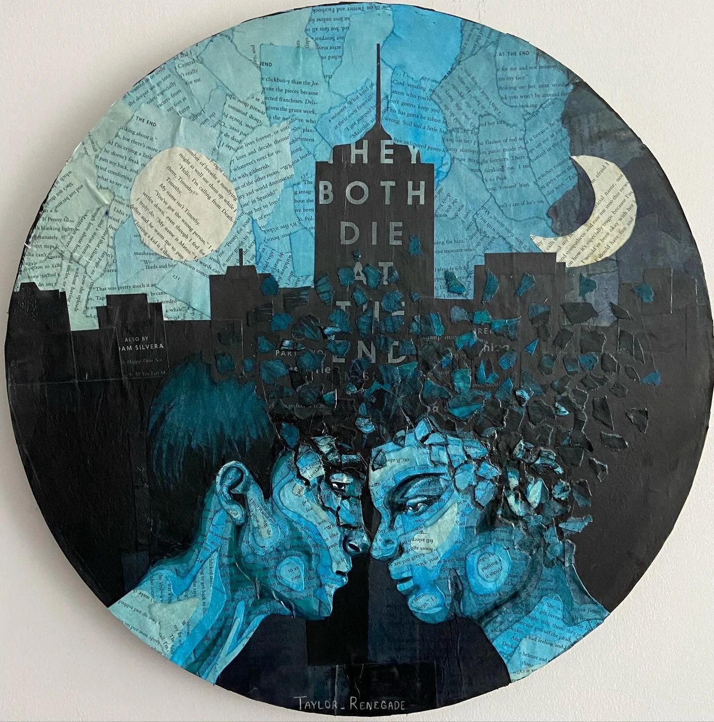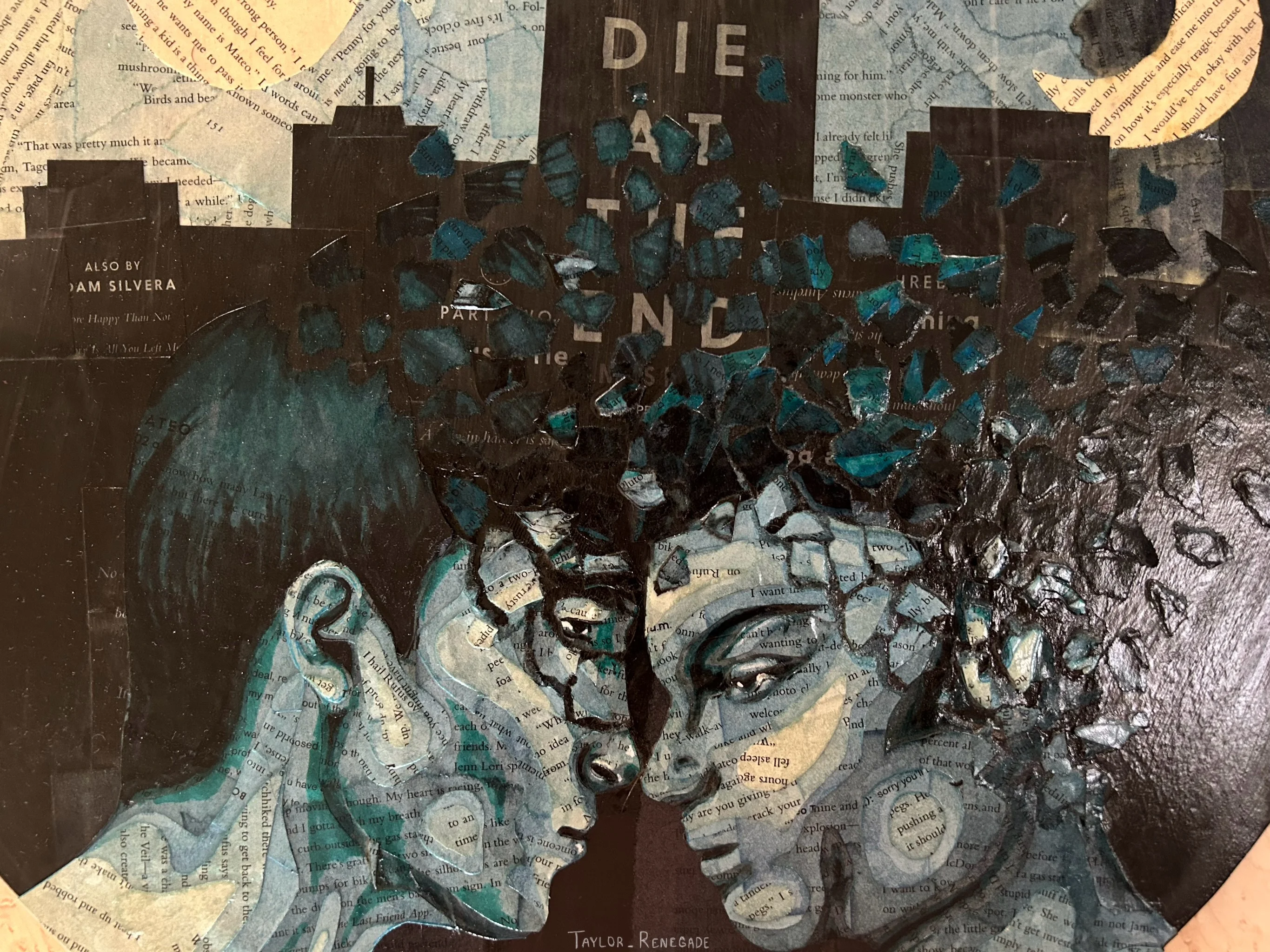 This project is an exploration of one of my all time favourite books “They Both Die at the End” by Adam Silvera. I took a copy of the book and cut and dyed the pages, turning the book itself into the artwork. The piece shows the two main characters Mateo and Rufus, showing their connection while grappling with their mortality at the same time.